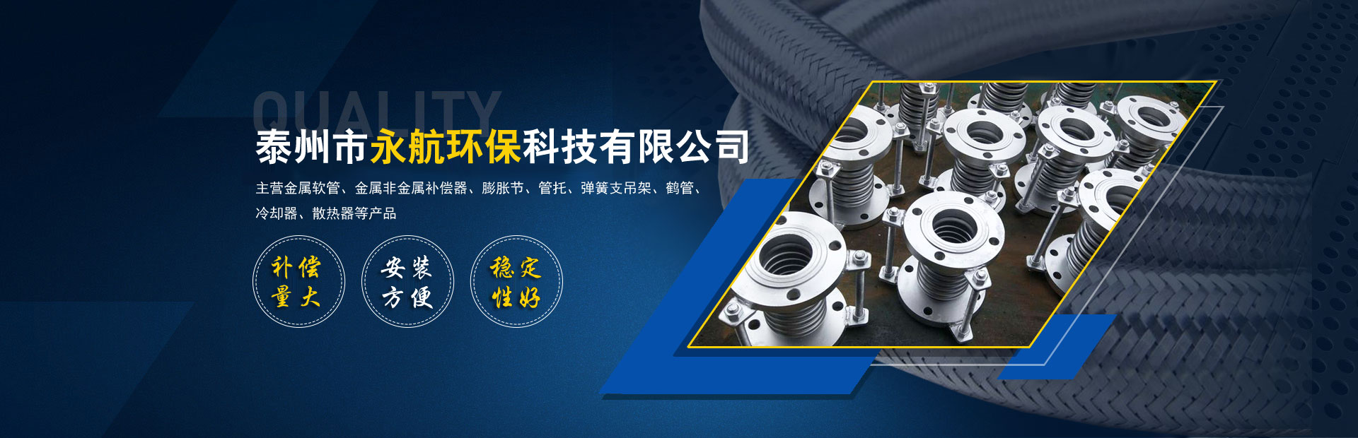 公司專注從事設計制造金屬膨脹節、不銹鋼金屬軟管、波紋管補償器、不銹鋼軟管、不銹鋼波形波紋補償器、矩形補償器、非金屬補償器、冷卻器、換熱器、風門、法蘭、管件、墊片、橡膠補償接管、減振器、減振墊和各類高壓軟管產品。